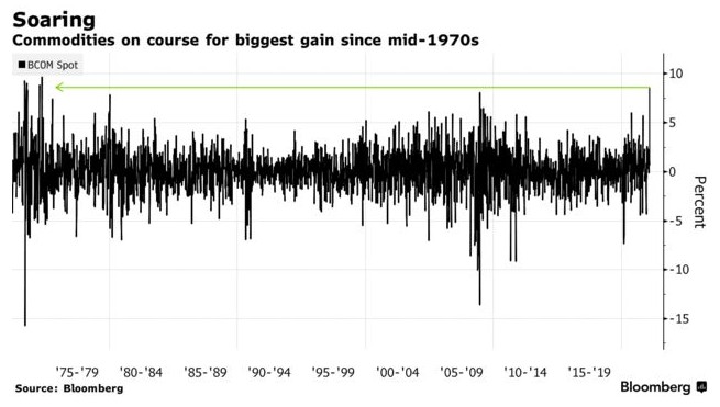 截至周三,BCOM指数本周累计上涨了8.6%,而由于该指数仅在全球每一交易日结束时更新,因此,目前该指数可能已经超过了1974年9月石油危机末期9.7%的涨幅,并将创下新的纪录(除非周五出现戏剧性的逆转)。