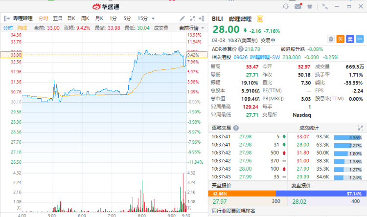 华盛资讯3月3日消息,美股盘中,中概股普遍走低。哔哩哔哩跌超7%,雾芯科技跌超8%,网易跌超5%,爱奇艺、拼多多跌超4%。