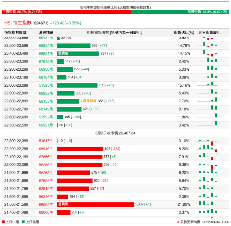 街货分布方面,至周四,恒指牛证街货贴价区间主要在收回价21900点至22400点之间,累计相当约2970张期指合约;恒指熊证街货在收回价22500点至23100点,累计相当约1948张期指合约。
