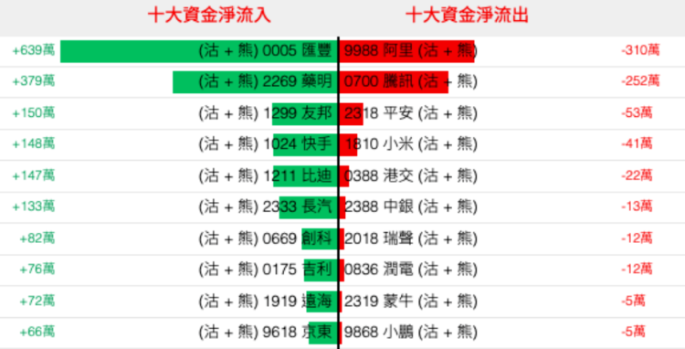 淡仓(认沽证及熊证)方面,周四汇丰、药明相关淡仓单日分别录得约639万、379万港元资金净流入;相反,阿里、腾讯相关淡仓单日分别录得约310万港元、252万港元资金净流出。