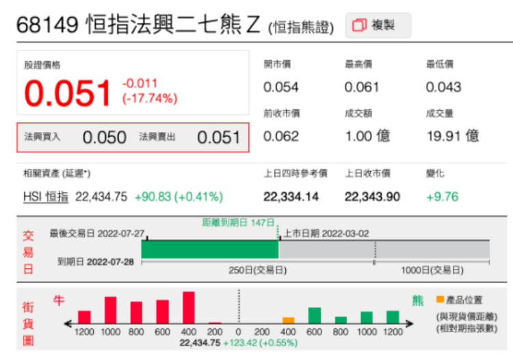 2、看错方向:恒指法兴二七熊Z(68149.HK),周四下跌17.74%。