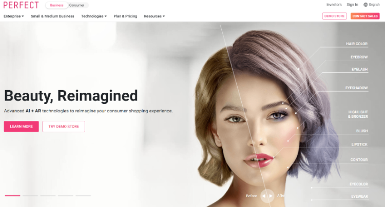 据悉,Perfect利用面部3D建模和人工智能深度学习技术,为美妆品牌提供产品试穿、面部诊断和数字咨询解决方案,允许消费者在购买前虚拟试穿服装和化妆品。