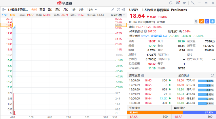 1.5倍做多恐慌指数ETF UVXY 大涨近7%,纳斯达克指数三倍做空ETF SQQQ盘前涨超2%。