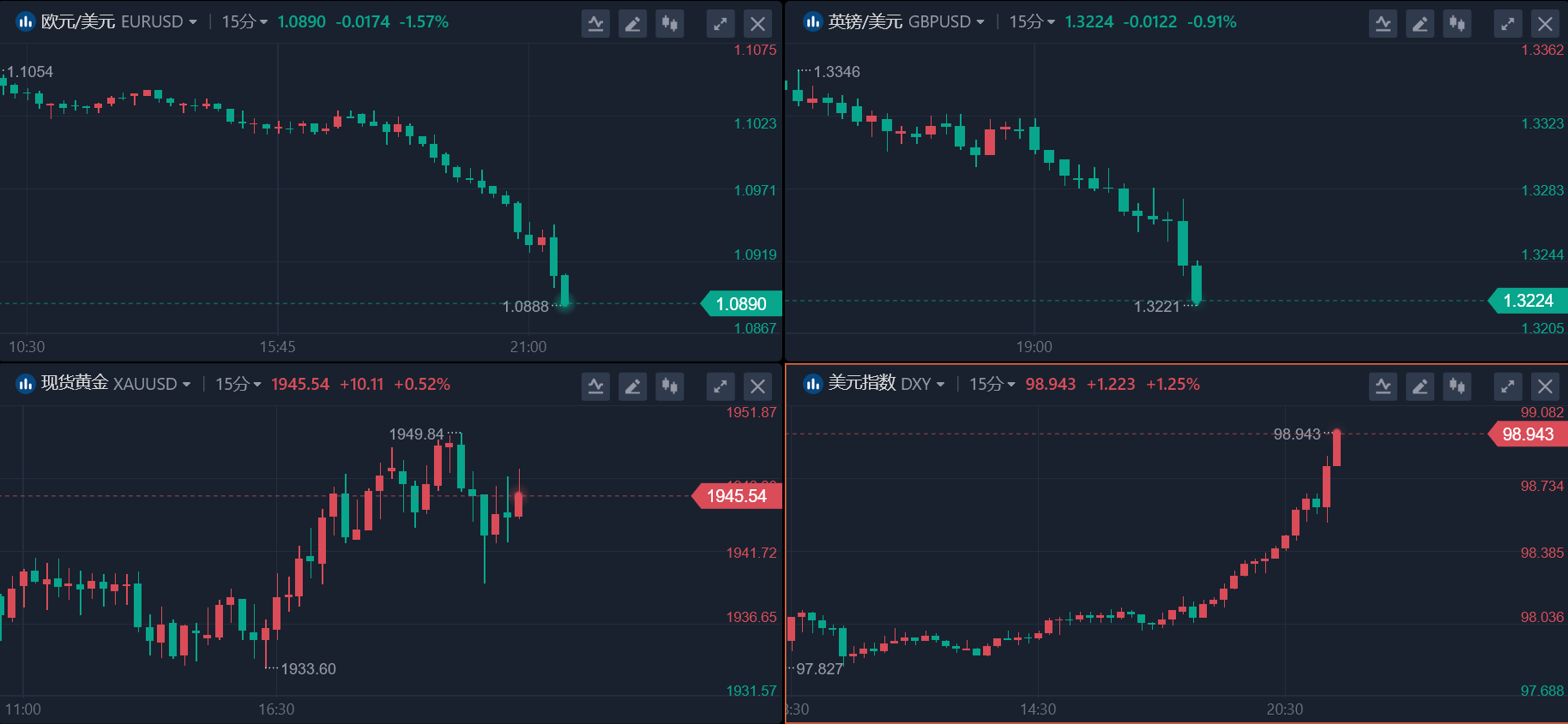 数据公布后,现货黄金短线走高2美元后回吐涨幅。美元指数短线走高32点;非美货币普遍走低,欧元兑美元短线下跌逾40点,英镑兑美元短线下跌30点。
