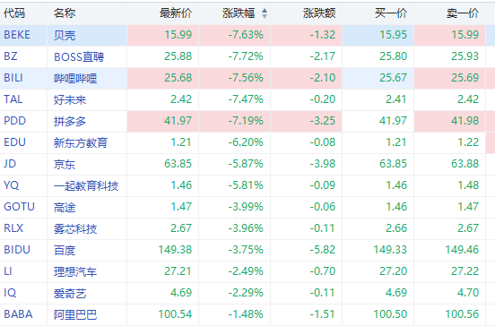 华盛资讯3月4日消息,美股盘中,热门中概股多数走低,BOSS直聘 $BZ 、贝壳 $BEKE 跌近8%,好未来 $TAL 、哔哩哔哩 $BILI 、拼多多 $PDD 跌超7%,一起教育科技 $YQ 跌近6%,京东 $JD 跌近6%,雾芯科技 $RLX 跌4%,阿里巴巴 $BABA 跌超1%。