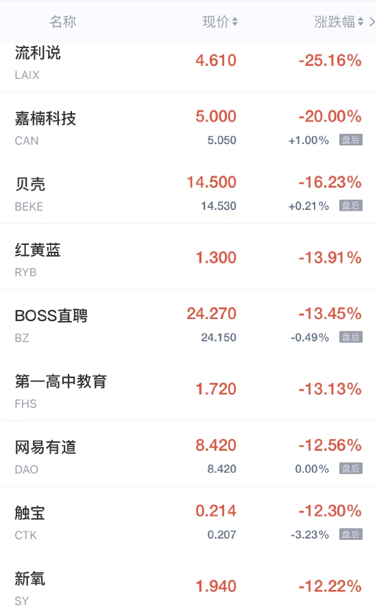 流利说跌超25%,嘉楠科技跌20%,贝壳跌超16%,红黄蓝跌近14%,BOSS直聘、第一高中教育跌超13%,网易有道、新氧、触宝、云米科技跌超12%,爱奇艺跌超11%,第九城市跌超10%,高途、好未来、迅雷跌超9%,哔哩哔哩、拼多多、趣头条、金山云跌超8%,新东方、斗鱼、携程、名创优品跌超7%,唯品会跌近7%,京东、虎牙、中网载线、微美全息、亿航跌超6%,百度、雾芯科技、欢聚集团、极光、汽车之家、一起教育、腾讯音乐跌超5%,腾讯跌超3%,瑞幸粉单、知乎跌超2%,阿里巴巴、网易跌超1%。