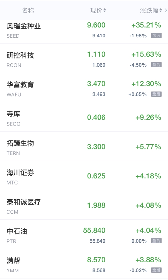 华富教育涨超12%,寺库涨超9%,海川证券涨超4%,满帮涨近4%,搜狐涨超2%。