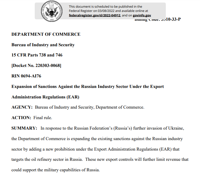 此外,根据美国商务部的声明,最新列入实体清单的91个实体因对俄罗斯安全事务、军事、国防部门以及国防研发工作有贡献或支持,将被实施出口管制措施。最新的制裁行动将进一步限制俄罗斯获取美国商品、软件和技术的能力。