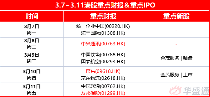 下周可关注京东集团 $09618.HK 、中兴通讯 $00763.HK 、友邦保险 $01299.HK 等财报。