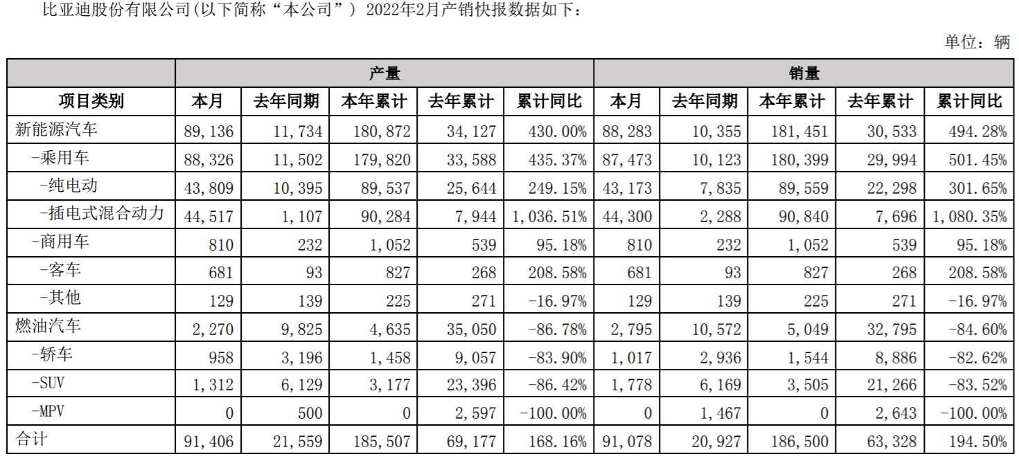 3月3日,比亚迪公布了2022年2月的产销数据。产量方面,比亚迪2月新能源汽车产量89136辆,全年累计产量约合18.09万辆,同比增长430%。销量方面,比亚迪2月新能源汽车销量88283辆,去年同期10355辆;本年已累计销量18.15万辆,同比增长494.28%。该公司2022年2月新能源汽车动力电池及储能电池装机总量约为4.615GWh,本年累计装机总量约为9.385GWh。