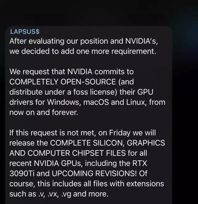 然后 Lapsus$ 向英伟达提出,删除所有 30 系显卡驱动中对挖矿功能的限制。本周二,看似为矿工说话的 Lapsus$ 改变了要求,也就是开源显卡驱动。