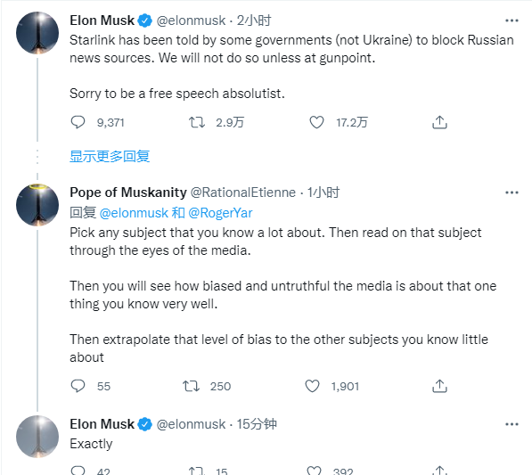 马斯克坚称:“一些政府 (不是乌克兰) 要求星链屏蔽俄罗斯的新闻来源。除非被枪指着,否则我们不会这么做。抱歉我是一个言论自由的绝对主义者”。