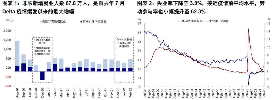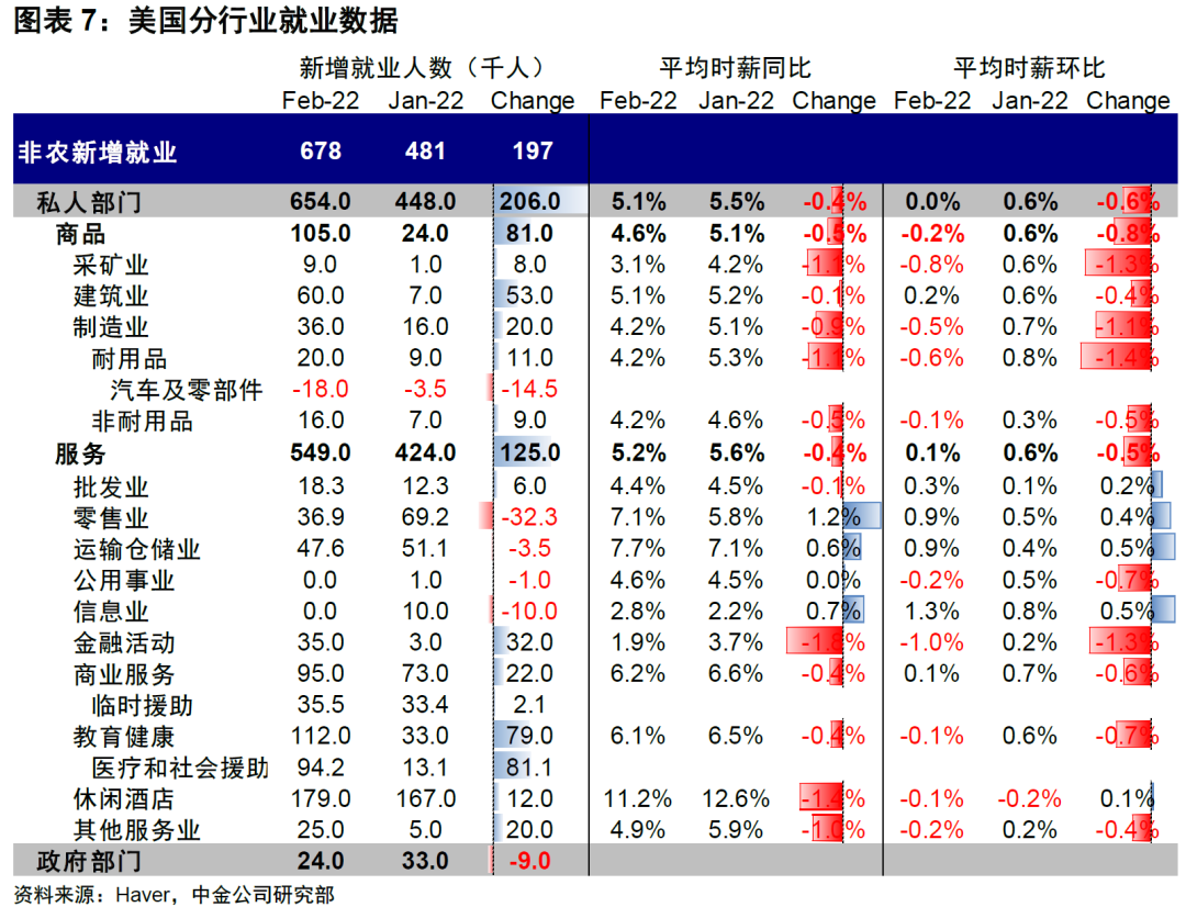 整体来看,此次就业数据在各方面都呈现出较好的修复迹象,例如不仅新增就业超出预期、劳动参与率也有改善,同时更重要的是薪资增速开始回落。2月就业市场修复强劲,非农新增就业人数67.8万人,大幅高于前值48.1万人(修正后)和预期42.3万人,是自去年7月Delta疫情爆发以来的最大增幅。与此同时,失业率下降至3.8%,接近疫情前平均水平,劳动参与率也小幅提升至62.3%,同时劳工部报告因疫情而无法工作的人数减少了180万[1]。更重要的是,得益于就业供给的增加,市场一直担心的工资通胀螺旋也有所缓解,2月工资环比持平0%增长,同比5.1%,均明显低于上个月的0.6%和5.5%,尤其是就业修复强劲的行业。