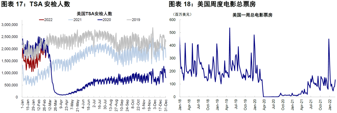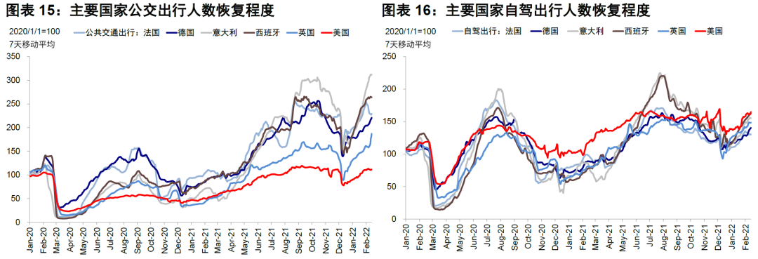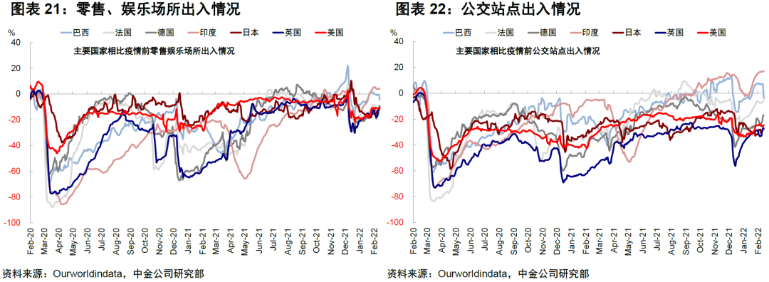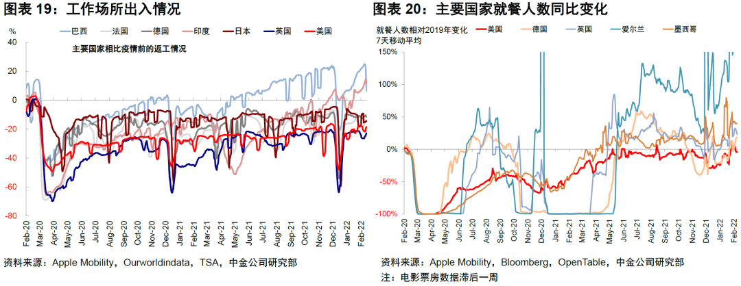 在疫情好转背景下欧美发达市场线下高频指标继续修复,公交出行、自驾、餐饮和工作场所出行均修复至此轮疫情爆发前水平;美国TSA安检人数达到2019年同期水平,票房数据继续回升。新兴市场中巴西和印度本周高频数据修复放缓,墨西哥餐饮人数维持较高水平。