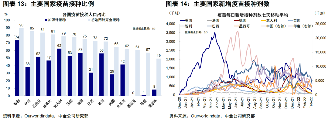 多国本周疫苗接种继续降速。美国日均接种下滑至16.1万剂,欧洲德国、法国、西班牙和英国等本周接种速度也有所下降。中国本周日均接种持平于553万剂,印度巴西降速。按接种比例看,中国、英国、美国完全接种比例分别为85%、72%和65%,加强针接种比例分别为38%、56%和29%。