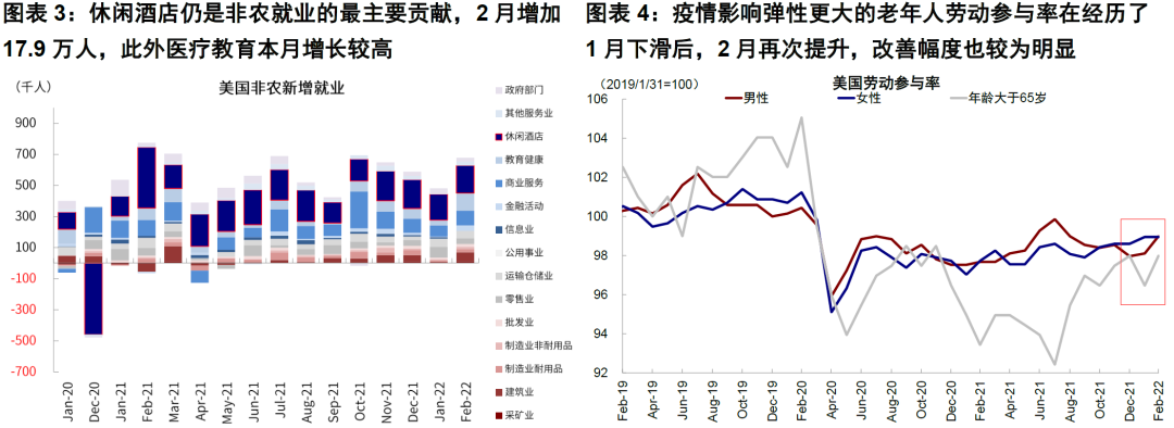结构上,与疫情改善相关的部门修复更为明显。1)按行业:休闲酒店仍是非农就业的最主要贡献,2月增加17.9万人,此外医疗教育本月增长较高。这与美国疫情见顶回落后,各州开始放松疫情限制措施可能有关(《疫情高点已过,欧美逐步开放》《多国取消限制进一步开放》)。