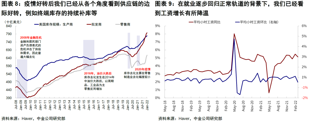 2月就业的改善并不意外,我们此前一直强调在关注供给端压力时,需要考虑疫情这个关键变量的影响,而且也提示疫情至少影响了相当一部分就业和供给的扰动。2月这一组数据也表明,虽然依然存在人口老龄化和金融资产过多的因素,但疫情依然在此前就业特别是劳动参与率修复缓慢的问题中贡献了相当一部分。与此相应的是供应链的边际修复,体现在码头效率、渠道和终端库存、供应交付时间等等(《疫情继续回落,供需都有改善》)。虽然目前的改善幅度对于彻底解决商品和劳动力市场的供需矛盾和价格压力依然“任重道远”,但至少不是进一步恶化的。