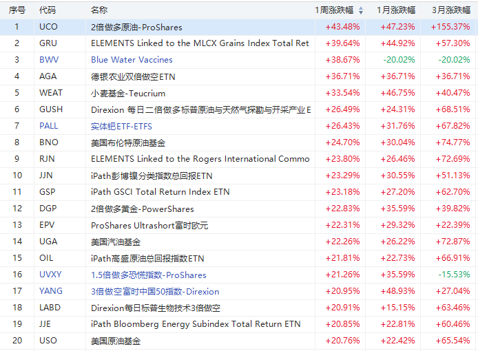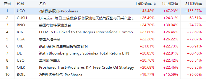 放眼能源ETF涨幅榜,做多原油相关的ETF,本周最少涨幅也在20%以上,带有2倍杠杆做多原油期货的UCO则涨近44%,2倍做多油气产业的GUSH涨近27%。