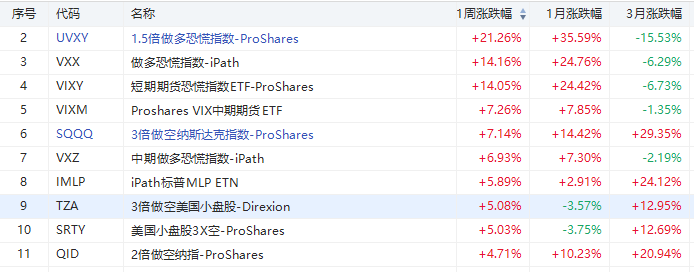 表现好的股指ETF中,以做空类ETF居多,1.5倍做多恐慌指数的UVXY一周涨超21%,3倍做空纳指ETF涨超7%。
