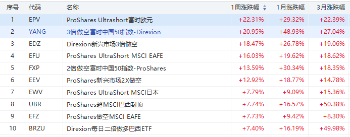 区域ETF方面,3倍做空富时中国50指数ETF $YANG 本周继续大涨,一周累涨20.95%。