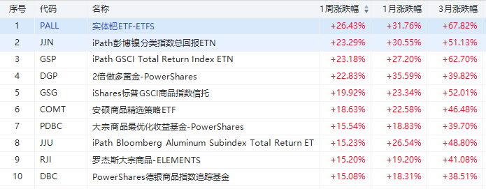 商品ETF中,实体钯ETF本周涨26.43%,现货钯金突破每盎司3000美元,为2021年5月以来首次;2倍做多黄金ETF周涨近23%,纽约商品交易所黄金期货市场4月黄金期货价格周五收于每盎司1966.6美元,一周上涨4.2%。