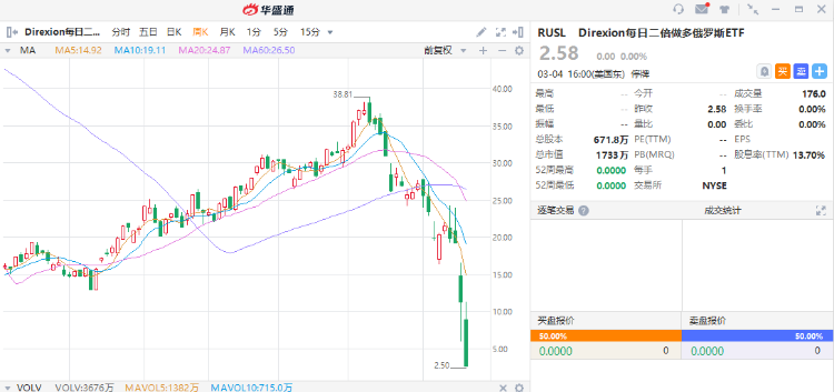 随着基金持续暴跌,Direxion发布公告,将于3月11日休市后停止Direxion每日二倍做多俄罗斯ETF RUSL 的交易,并定于3月18日对其进行清算。