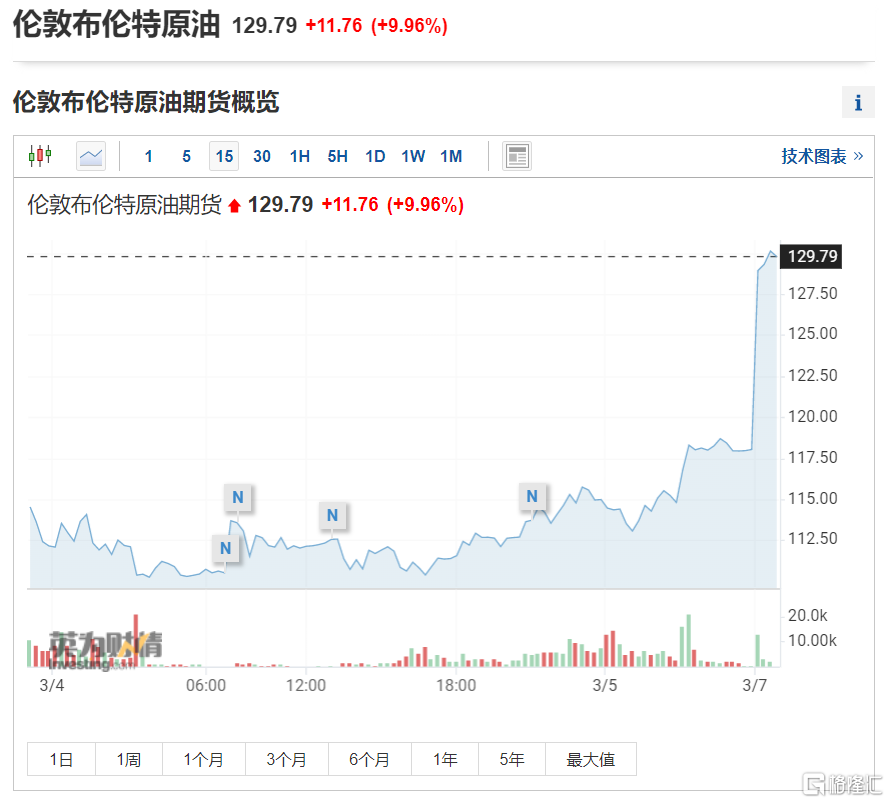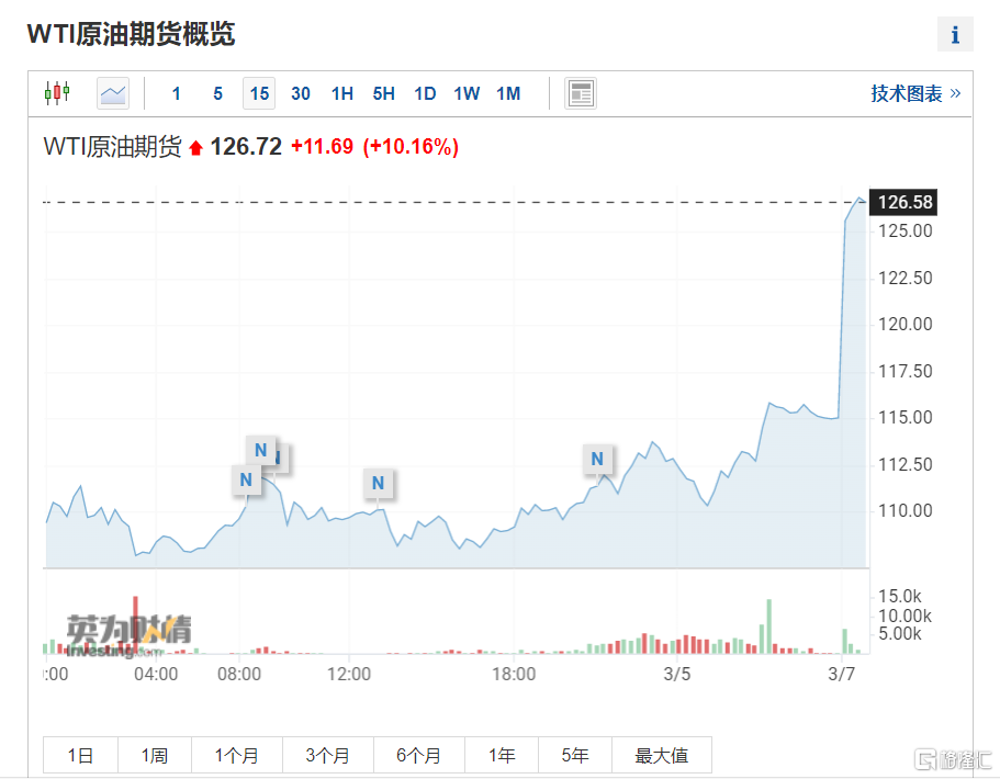周一开盘,美、布原油期货开盘直线飙涨。 美、布原油期货开盘涨超10%。其中布伦特原油一度拉升20美元,最高至138.02美元/桶,WTI原油期货突破130美元/桶。