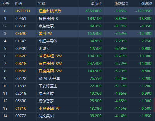 其中,美团跌超8%,京东集团跌超7%,哔哩哔哩跌近7%,百度集团跌超6%,阿里巴巴跌近5%,腾讯控股、商汤跌超4%。