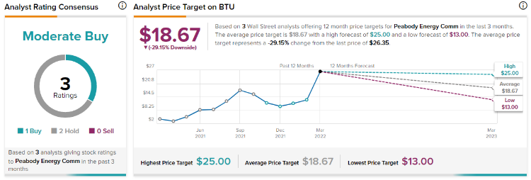 此外,Tipranks数据显示,3名追踪BTU的华尔街分析师中,有2人给出了“持有”评级,平均目标价为18.67美元。