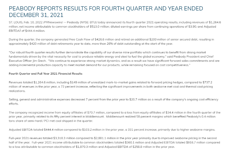 2月10日,Peabody Energy $BTU 发布了截至2021年12月31日的Q4和年度业绩。