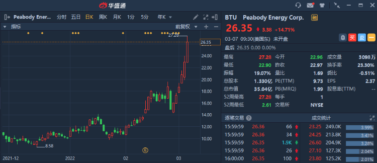 發仔近期注意到,主营煤炭业务的Peabody Energy $BTU 股价已连涨6日,6日涨幅达75.9%,年内涨约161.7%。更令人惊讶的是,该股去年表现也极其出色,年涨幅近320%!