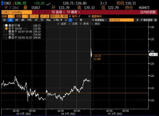 昨日,美国国务卿布林肯表示,总统拜登和政府各部门正讨论是否对俄罗斯实施石油禁运,消息一出,原油价格再度暴涨。3月7日周一,布伦特原油价格一度上涨18%至139.13美元,受此影响,美股三大期指盘前一度跌近2%。