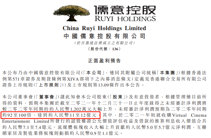 3月 7日,中国儒意(00136.HK)发布正面盈利预告,称截至2021年12月31日止年度未经审核净利润将较2020年同比大幅上升,预计达到人民币约11至12亿元,是2020年的约92-100倍。