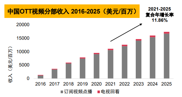 根据普华永道的预计,中国OTT视频市场正日益成熟,预计2021年到2025年复合年增长率将达到11.86%,超过全球平均9.38%的增速。至2025年,收入将达到173亿美元,市场空间广阔。