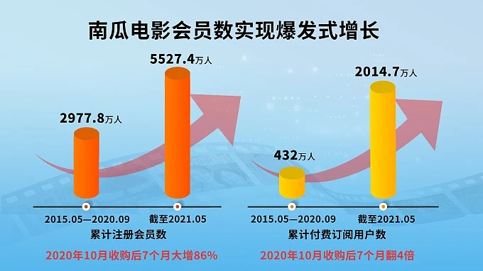 而旗下流媒体平台南瓜电影APP也就有了极为丰富的内容支持。作为会员订阅制媒体平台,南瓜电影截至2021年上半年的注册会员数达到6194万人,累计付费订阅用户数达到2462万人,处于超高速增长趋势。