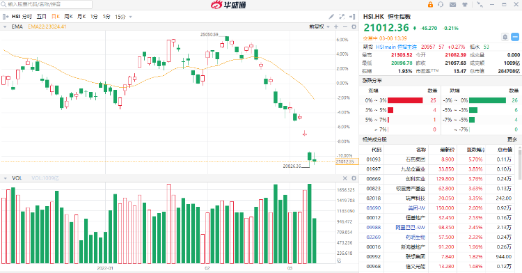 这无疑是对被战争疑云拉下水的股市又一次打击。周一收盘,美三大股指齐齐大幅下挫,全球股市全面沦陷,恒生指数一度跌近5%,失守21000点。腾讯、阿里巴巴、哔哩哔哩等明星科网股纷纷刷新新低,市场一片“惨不忍睹”。