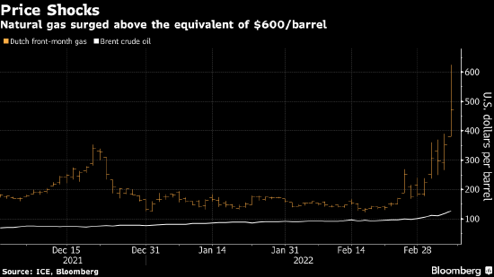 欧洲基准天然气期货飙升79%,达到相当于每桶原油超过600美元,市场出现了有史以来最为混乱的交易状况。飙升可能引发大规模的追加保证金,促使企业购买交易所合约以避免支付现金,进而导致期货价格进一步飙升。