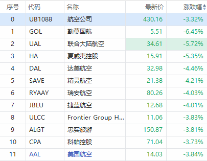 美股航空股普跌,勒莫国航(GOL)跌超6%,夏威夷航空(HA)、联合大陆航空(UAL)跌超5%,达美航空(DAL)跌超4%,美国航空集团(AAL)跌超3%。