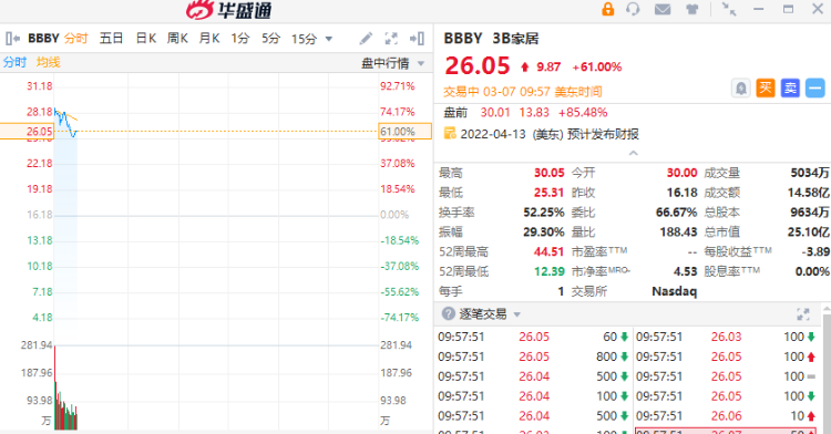 美国零售商3B家居(BBBY)周一盘初股价飙升,消息面上,游戏驿站董事会主席Ryan Cohen大量入股3B家居,并推动这家家居用品零售商精简战略,探索战略替代方案。截至发稿,3B家居涨61%,报26.05美元。