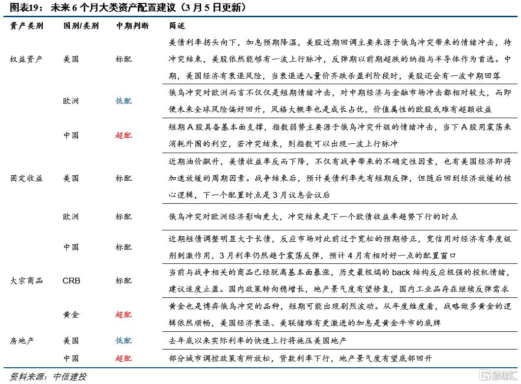 市场展现出极度割裂的定价:商品以历史少见的波动率暴涨,而美债收益率反而出现“牛平”的特征,3月加息预期显著降温,黄金继续上涨,但权益市场没有定价加息预期降温的利好,资金去后周期板块避险。这种极度割裂的定价表现出当前主要矛盾是战争带来的不确定性,同时在滞与胀的抉择中,市场并未进一步定价“通胀-加息预期”螺旋式上升,反而对经济给了更大的权重。因此当前等待冲突结束,市场会回归到原有的主线逻辑。继续追涨与战争相关的商品不是最好的选择,增配前期超跌的权益更为合适。
