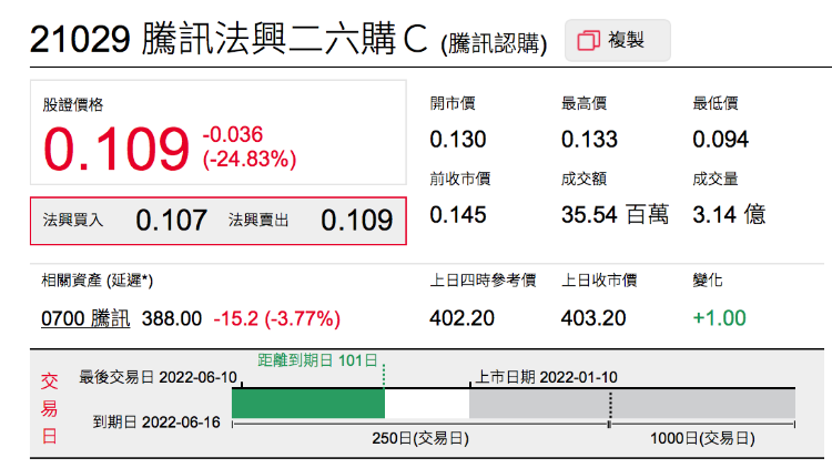 2、看错方向:腾讯法兴二六购(21029.HK),周一下跌24.83%。