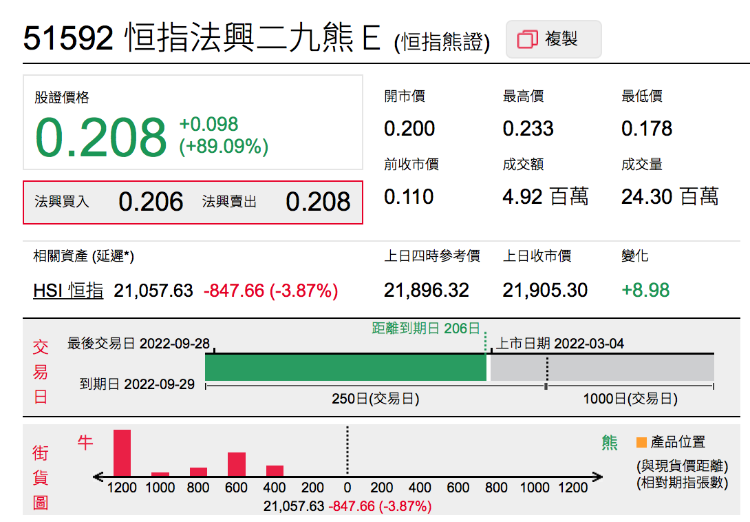 1、强势轮证:恒指法兴二九熊(51592.HK),周一上涨89.09%;