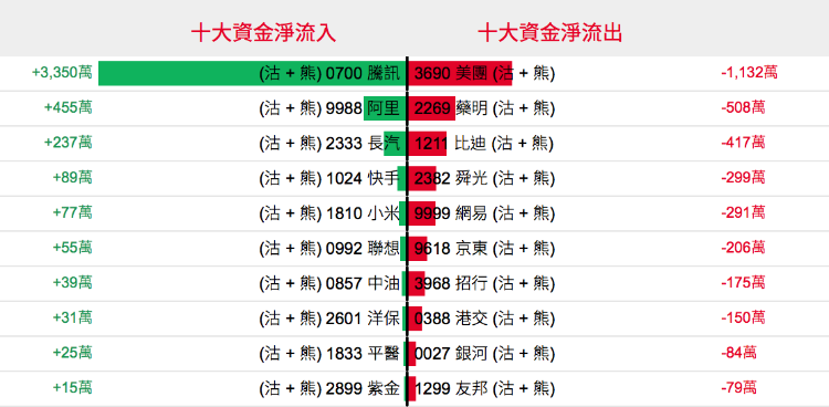 淡仓(认沽证及熊证)方面,周一腾讯相关淡仓单日录得约3,350万港元资金净流入;相反,美团、药明相关淡仓单日分别录得约1,132万、508万港元资金净流出。