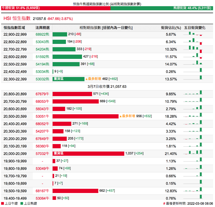 街货分布方面,至周一,恒指牛证街货重货区间主要在收回价20000点至20600点之间,累计相当约2,745张期指合约;恒指熊证街货重货区主要在收回价22300点至22800点,累计相当约1,622张期指合约。