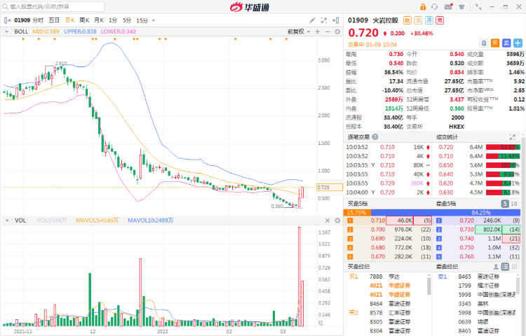 华盛资讯3月9日消息,火岩控股盘初大幅拉涨,续升38%。本周开始,公司正式成为港股通交易标的。这将有效提升内地投资者对公司的关注度和认知度,有望提升公司股票流动性。截至发稿,火岩控股涨38.46%,报0.72港元,成交额0.36亿港元,两日累涨超84%。