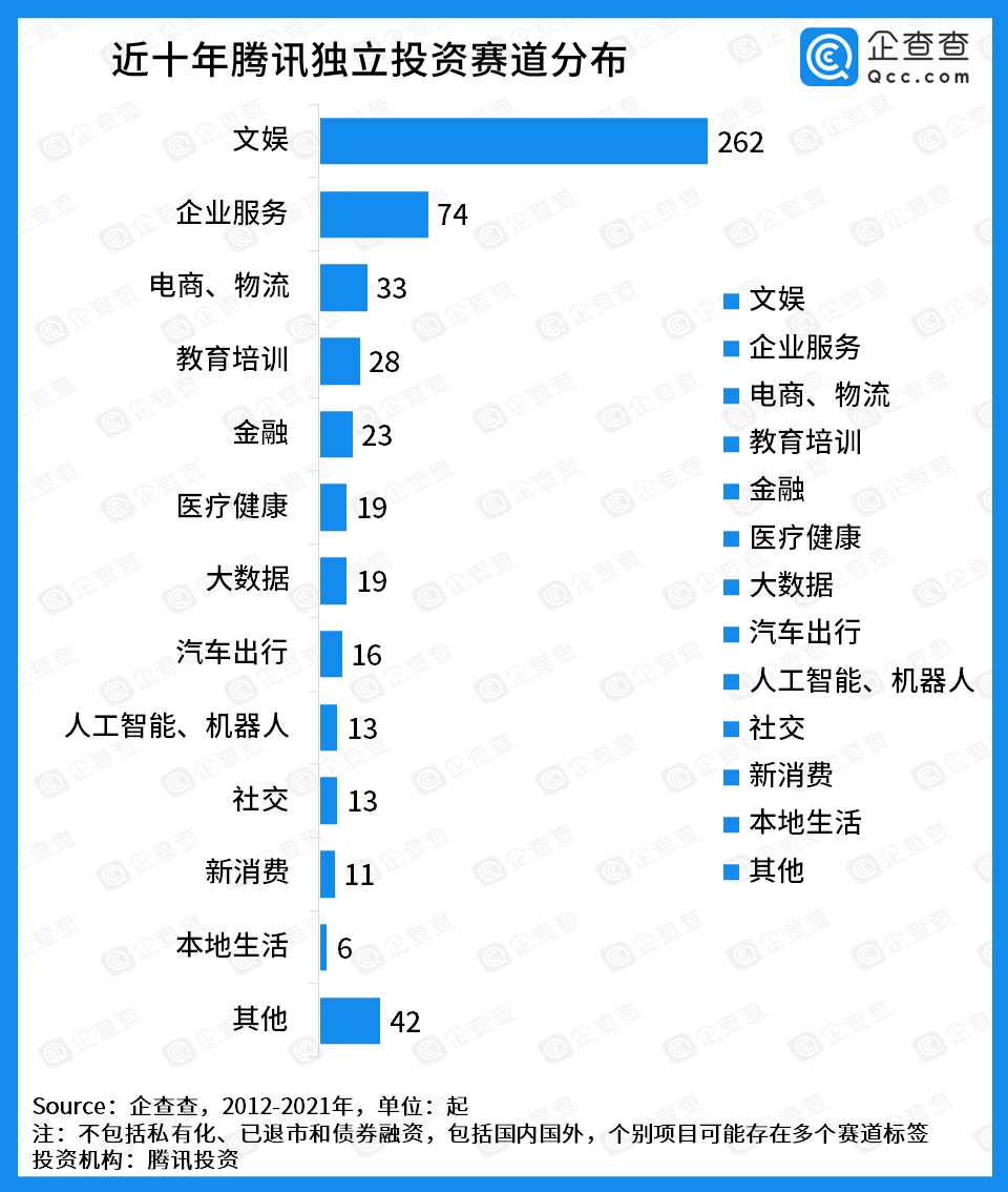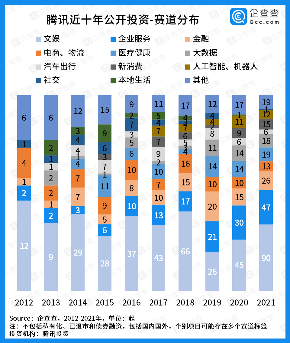 近十年腾讯一共推动了1175起公开投资,其中独立投资共537起,占比45.7%,主要集中在文娱赛道,投资达262起,占比高达48.8%。从时间线来看,整体处于缓慢爬升趋势,2019年达到51起,2020年达到77起,2021年达到136起,同比增长76.6%。