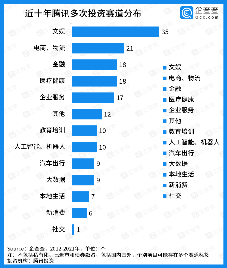 企查查数据显示,近十年腾讯公开参投项目925个,其中多次投资项目共有160个,占比17.3%。也就是说,在腾讯投出的项目中,每10个项目就有2个有可能被腾讯多次加注。从赛道分布来看,获得多次加码的文娱项目数量最多,达到35个;其次是电商物流项目,也有21个;获得多次加码的金融项目、医疗健康项目均达到了18个。