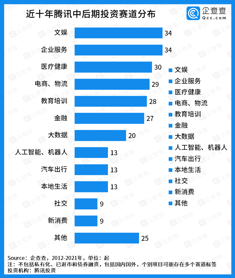 企查查数据显示,近十年腾讯一共推动了1175起公开投资,其中早期投资(种子/天使轮、A轮、B轮)共492起,占比41.9%,主要集中在文娱赛道,共有171起;中后期投资(C轮、D轮及以后)共254起,占比21.6%,主要分布在文娱、企业服务、医疗健康、电商物流、教育培训、金融等赛道。
