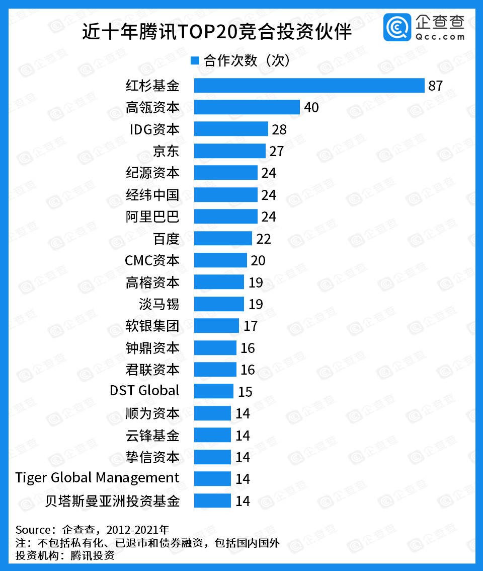 从合投数量来看,企查查数据显示,截至2021年底,腾讯与“红杉基金”合作87次,在金融、电商物流和医疗健康赛道的合作次数最多,分别有14次、12次和10次,合作投资了拼多多、兴盛优选、美团、饿了么、满帮集团、贝壳找房、智慧芽PatSnap等项目。排名第二的是“高瓴资本”,合作高达40次,在金融和新消费赛道的合作次数最多,均有6次,合作投资了猿辅导、蔚来汽车、喜茶、KEEP、摩拜单车等项目。值得注意的是,与腾讯合作超过一次的投资机构超270个。