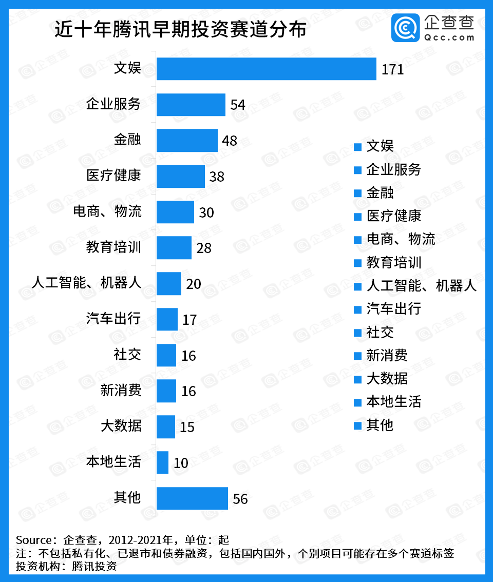 值得注意的是,在早期投资中,腾讯集中加码文娱赛道,达到了171起,排在第二位的企业服务赛道,仅有54起。而腾讯的中后期投资在赛道分配方面比较平均,文娱、企业服务等6个赛道的投资事件均在30起左右。